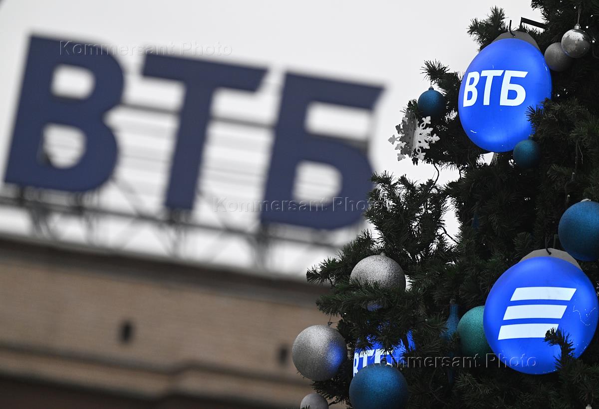 Виды Москвы. Жанровая фотография. Елочная игрушка с логотипом банка ВТБ на новогодней городской елке.