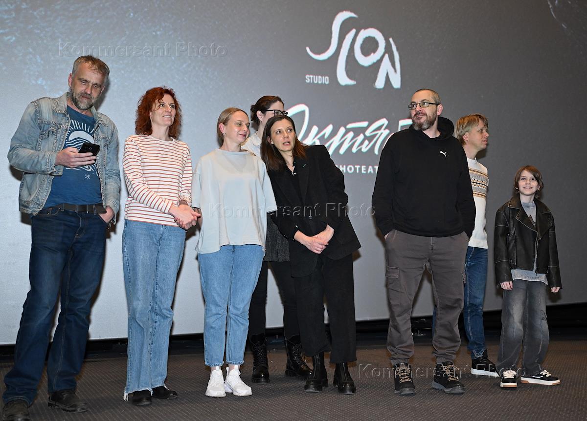 Премьера фильма "Агния" режиссера Павлы Стратулат в кинотеатре "Октябрь". Слева направо: актеры Владимир Литышев, Сергей Черданцев, режиссер Павла Стратулат, актеры Татьяна Клюкина, Александра Бабаскина, Александра Виноградова, Евгения Громова и Сергей Гилёв на премьере.