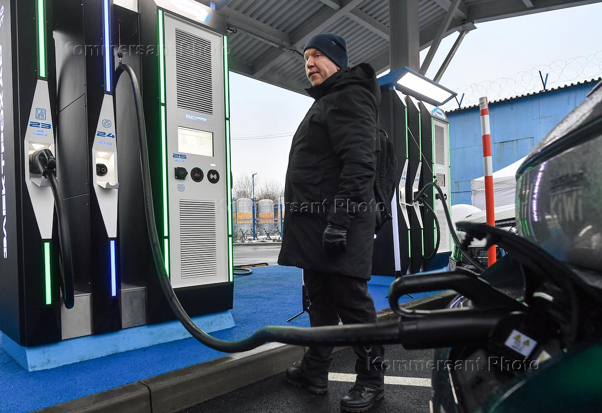 Церемония открытия электрохаба (станции для зарядки электромобилей) "Выборгский" по адресу улица Жукова, 26. Жанровая фотография. Автомобиль во время зарядки.