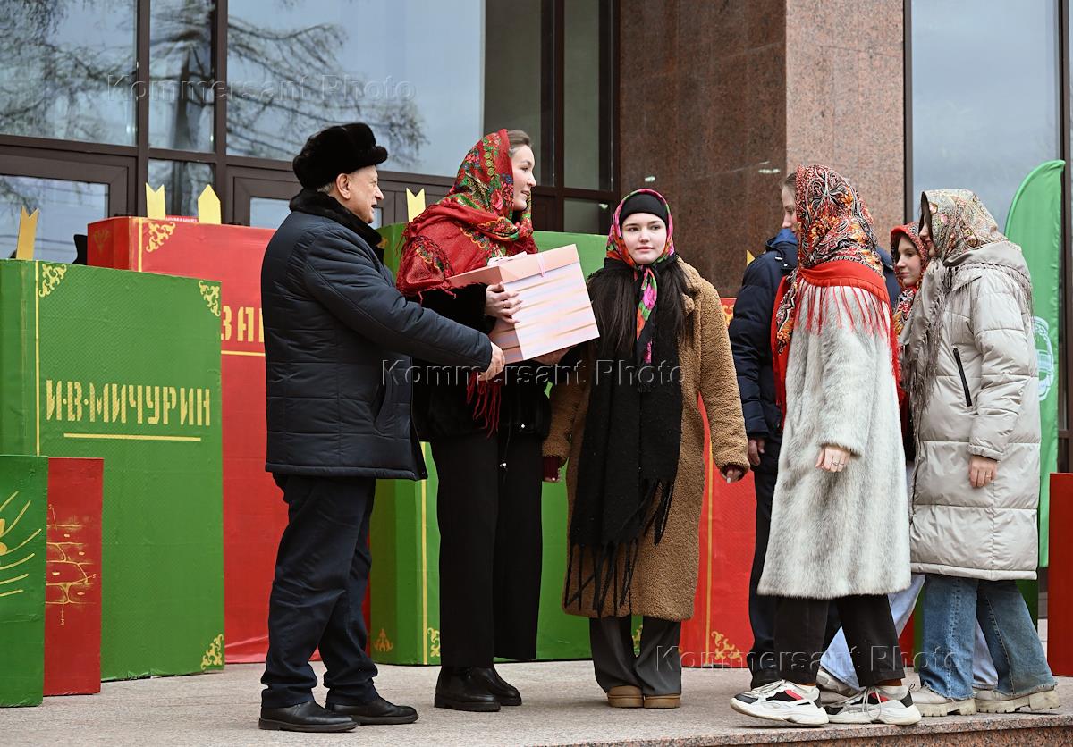 Праздничные мероприятия, посвященные Дню российского студенчества, в Российском Государственном Аграрном Университете - МСХА имени К.А.Тимирязева. Парад студенческих саней на площади перед Центральной научной библиотекой (ЦНБ) имени Н.И. Железнова. Ректор Российского государственного аграрного университета-МСХА имени К.А.Тимирязева Владимир Трухачев (слева) во время парада.