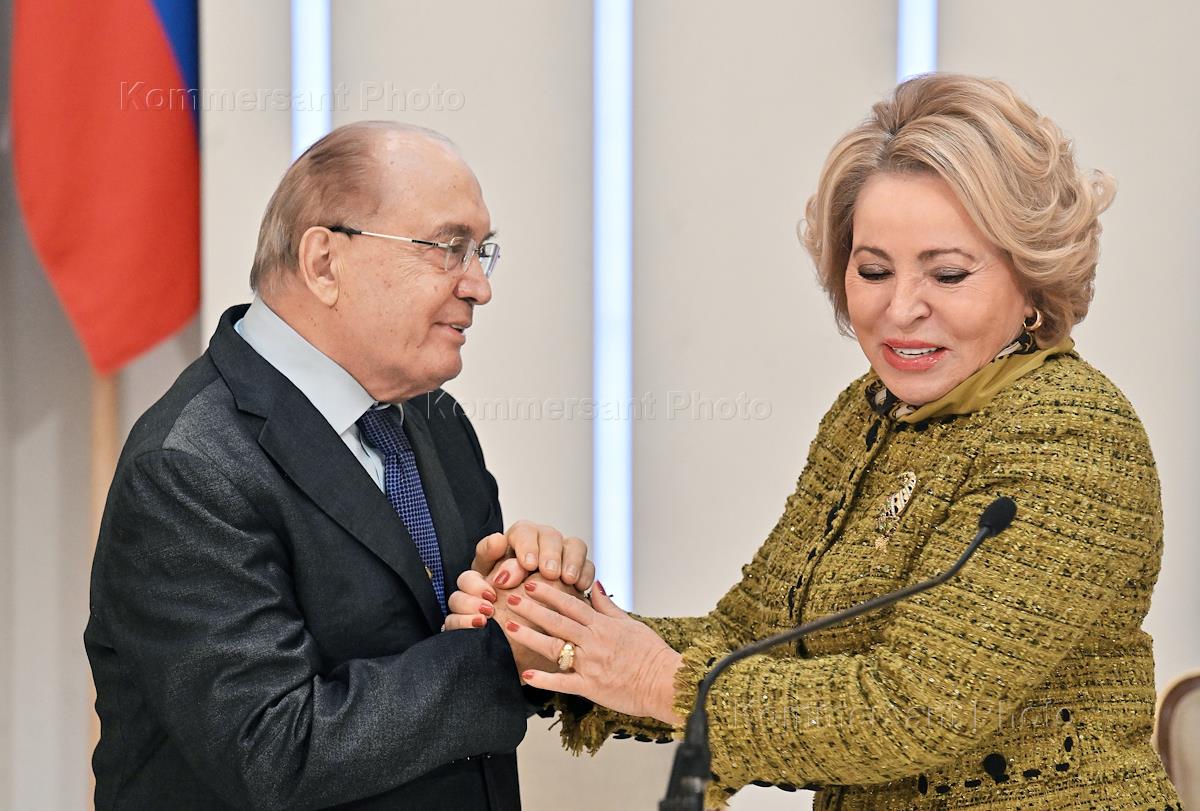 Церемония открытия Дней Московского государственного университета (МГУ) имени М.В. Ломоносова, посвященная 270-летию образования МГУ, в Совете Федерации России. Председатель Совета Федерации России Валентина Матвиенко (слева) и ректор МГУ имени Ломоносова Виктор Садовничий (справа) во время церемонии.