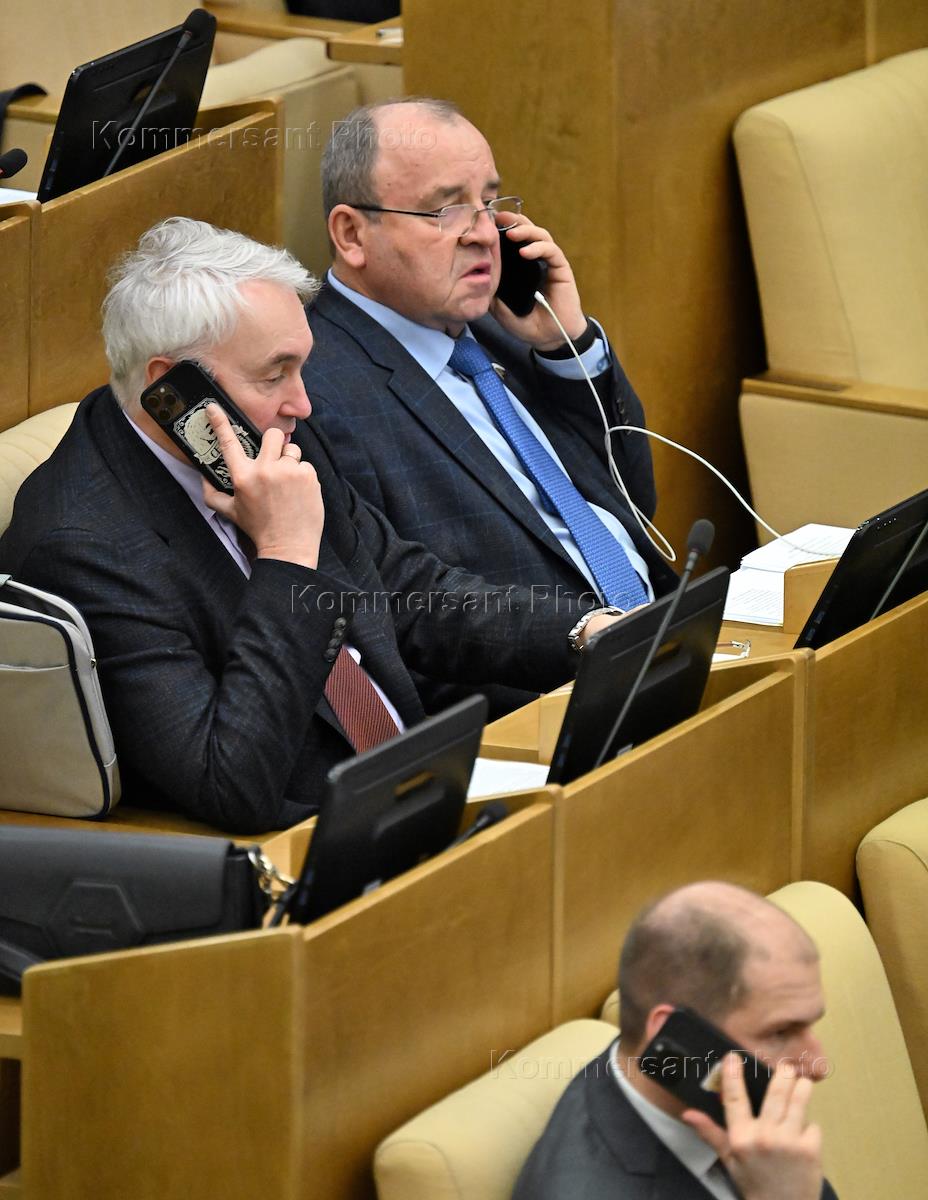 Пленарное заседание Государственной думы (ГД) России. Член комитета ГД России по транспорту и развитию транспортной инфраструктуры Виталий Ефимов (слева) и первый заместитель председателя комитета ГД России по развитию Дальнего Востока и Арктики Вячеслав Логинов (справа) во время заседания.