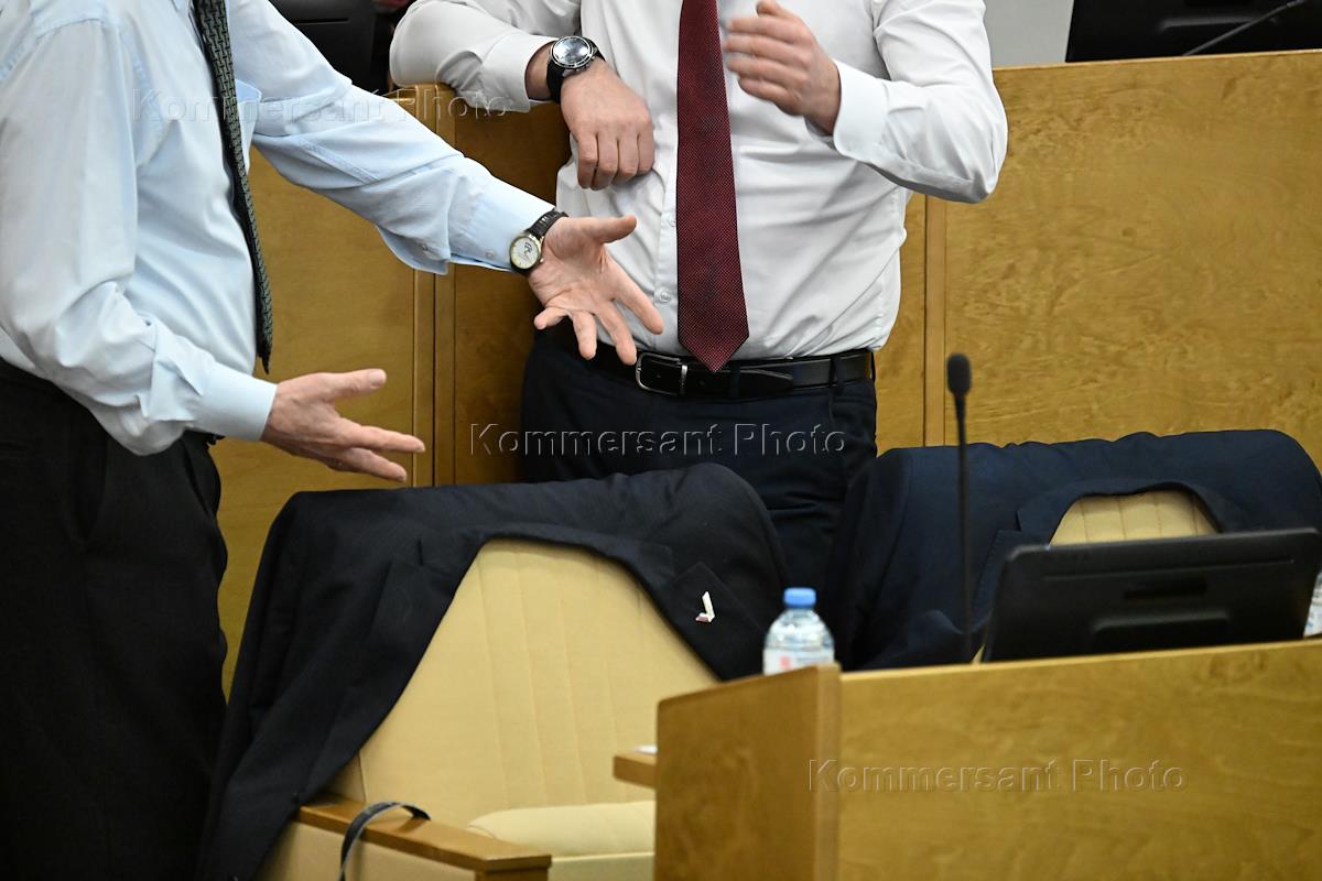 Пленарное заседание Государственной думы (ГД) России. Член комитета ГД России по экологии, природным ресурсам и охране окружающей среды Тимофей Баженов (слева) во время заседания.