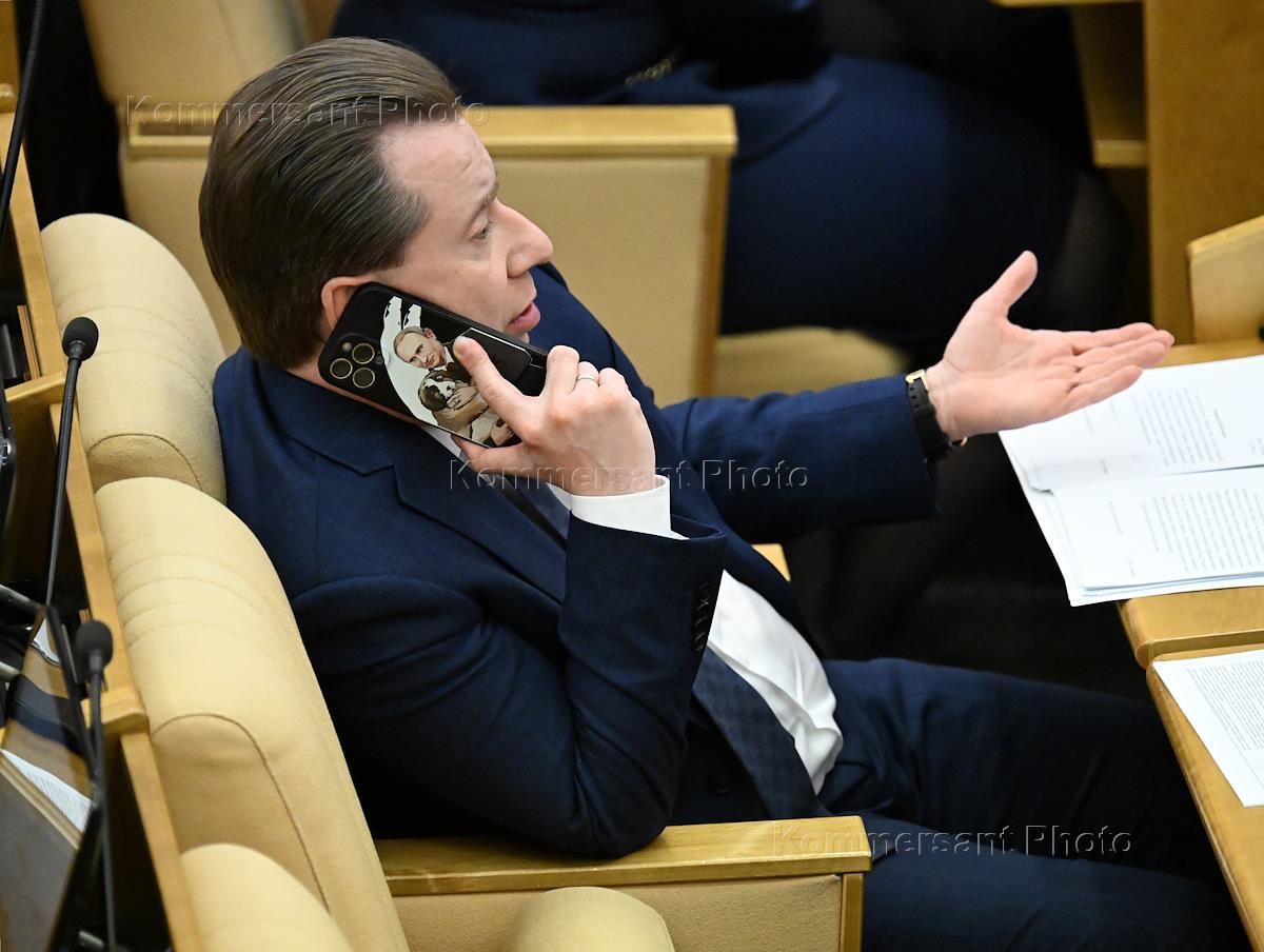 Пленарное заседание Государственной думы (ГД) России. Член комитета ГД России по бюджету и налогам Антон Красноштанов (справа) во время заседания.