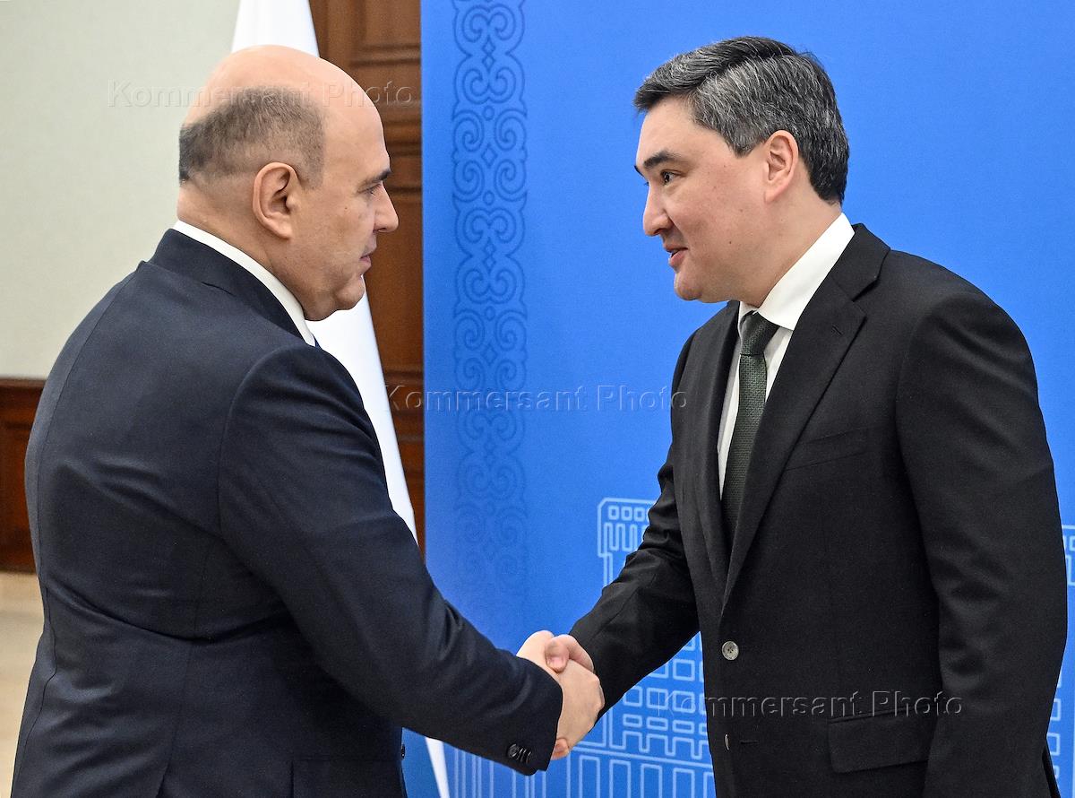 Рабочая поездка председателя правительства России Михаила Мишустина в Казахстан. Председатель правительства России Михаил Мишустин (слева) и премьер-министр Казахстана Олжас Бектенов (справа) во время встречи.