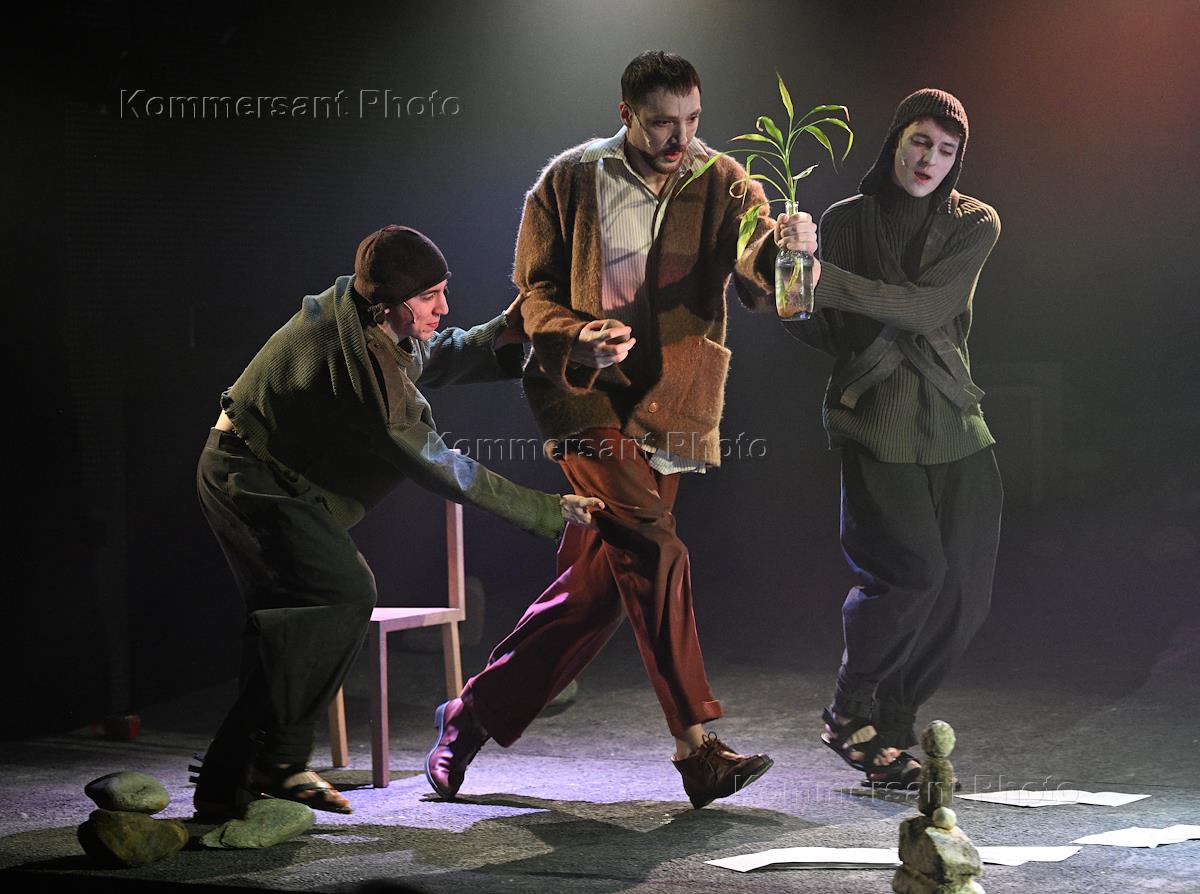Пресс-показ спектакля "Голиаф" режиссера Александра Золотовицкого в театре "Шалом". Слева направо: актеры Александра Ахметзянова, Сергей Шадрин и Иван Орлов во время спектакля.
