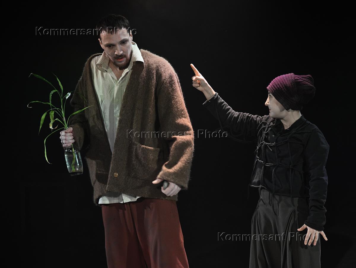 Пресс-показ спектакля "Голиаф" режиссера Александра Золотовицкого в театре "Шалом". Актеры Александра Ахметзянова (справа) и Иван Орлов во время спектакля.