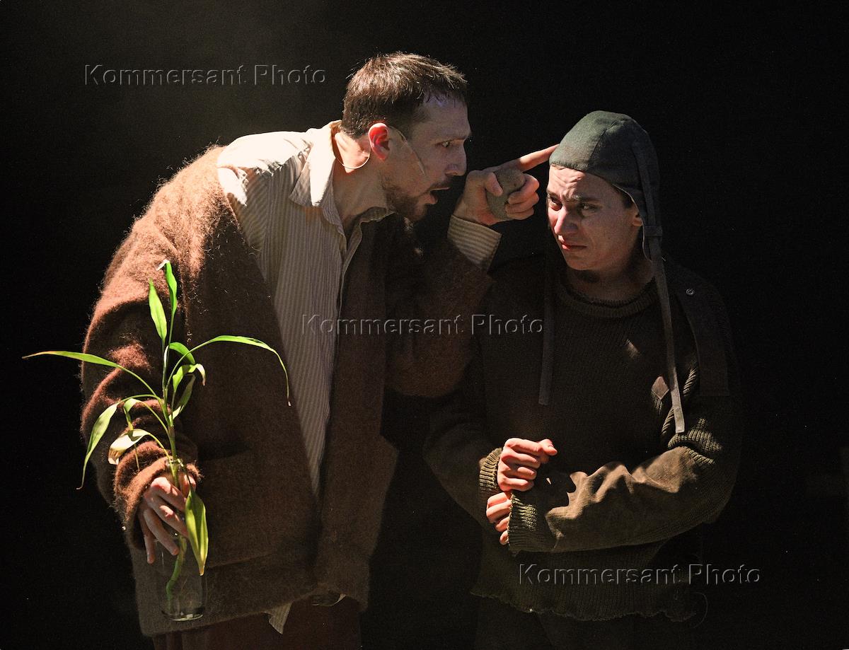 Пресс-показ спектакля "Голиаф" режиссера Александра Золотовицкого в театре "Шалом". Актер Иван Орлов (слева) и Федор Бычков во время спектакля.