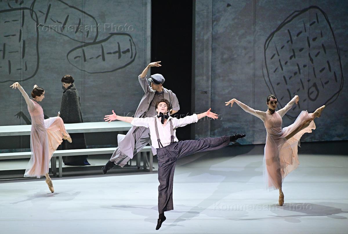 Балетный спектакль "Две Анны", совместный проект Международного фестиваля искусств "Дягилев P.S." и продюсерской компаний MuzArts, на сцене Большого драматического театра имени Г.А.Товстоногова. Артист балета Алексей Путинцев (в центре) во время спектакля.