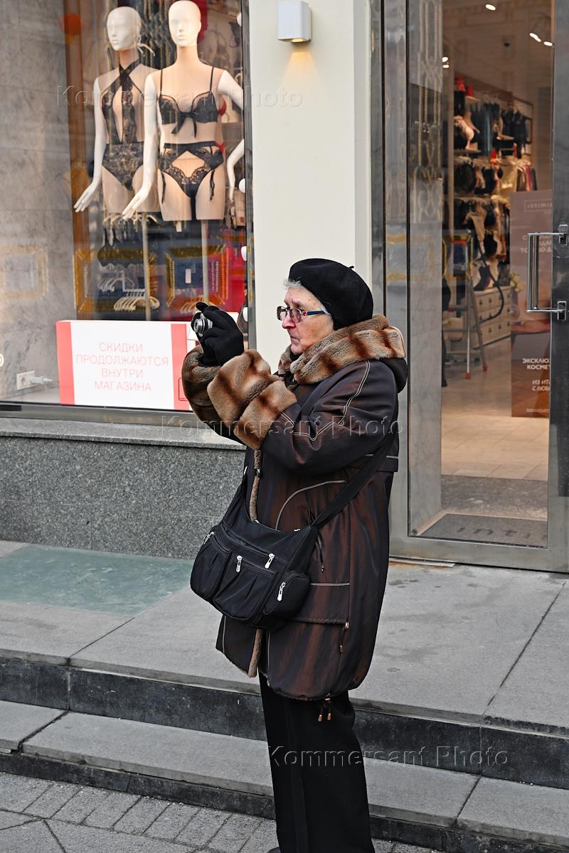 Виды Москвы. Жанровая съемка. Пожилая женщина с фотоаппаратом на фоне бутика нижнего белья.
