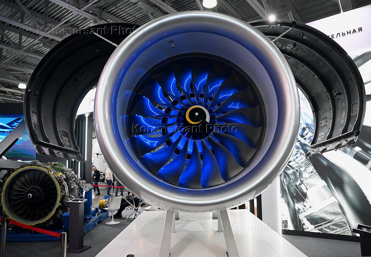 12-я Национальная выставка и форум инфраструктуры гражданской авиации NAIS в Международном выставочном центре "Крокус Экспо". Стенд производителя российского турбовентиляторного двигателя ПД-14 на выставке.