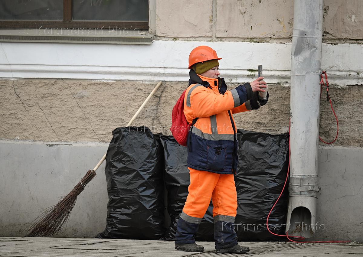 Жанровая фотография. Сотрудник городской коммунальной службы фотографирует результат убранной территории.