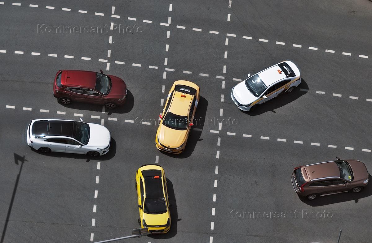 Жанровая фотография. Дорожно-транспортное происшествие между автомобилями такси на улице.