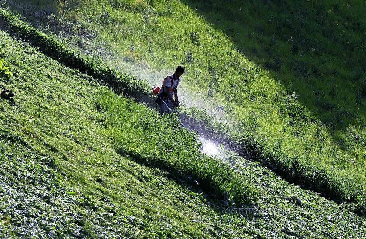 Виды Нижнего Новгорода. Жанровая фотография. Сотрудники муниципальных служб косят траву на Волжском откосе.