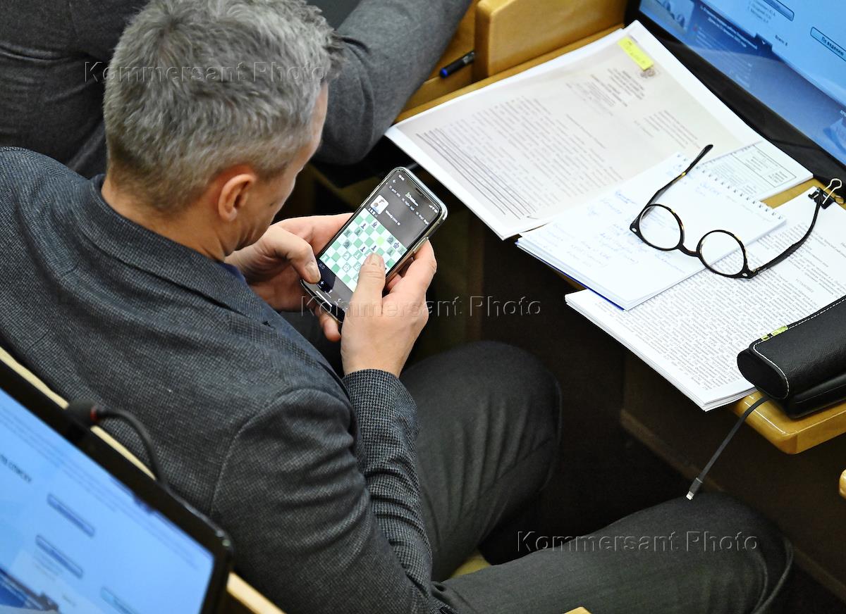 Пленарное заседание Государственной думы (ГД) России. Жанровая фотография. Депутат во время игры в шахматы в приложении "Chess.com" на мобильном телефоне во время заседания.