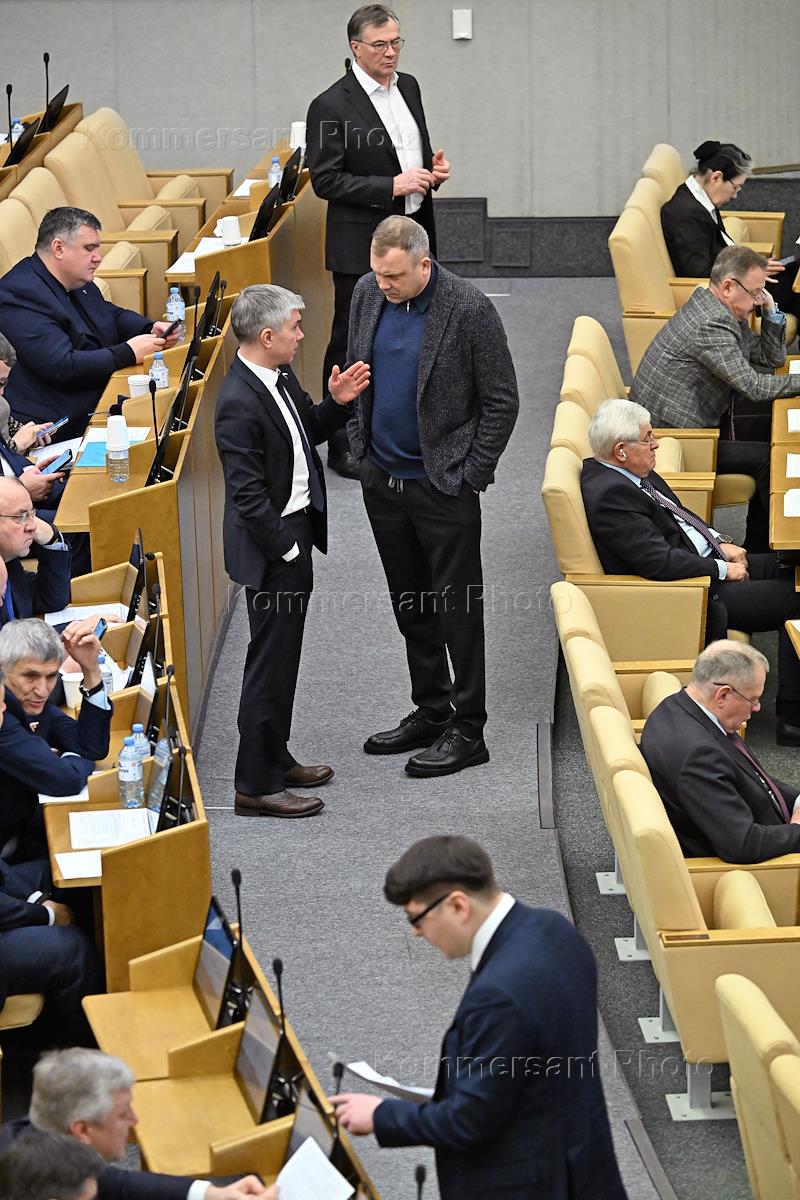 Пленарное заседание Государственной думы (ГД) России. Член комитета ГД России по транспорту и развитию транспортной инфраструктуры Андрей Колесник (в центре) член комитета ГД России по защите семьи, вопросам отцовства, материнства и детства Татьяна Ларионова (справа) во время заседания.