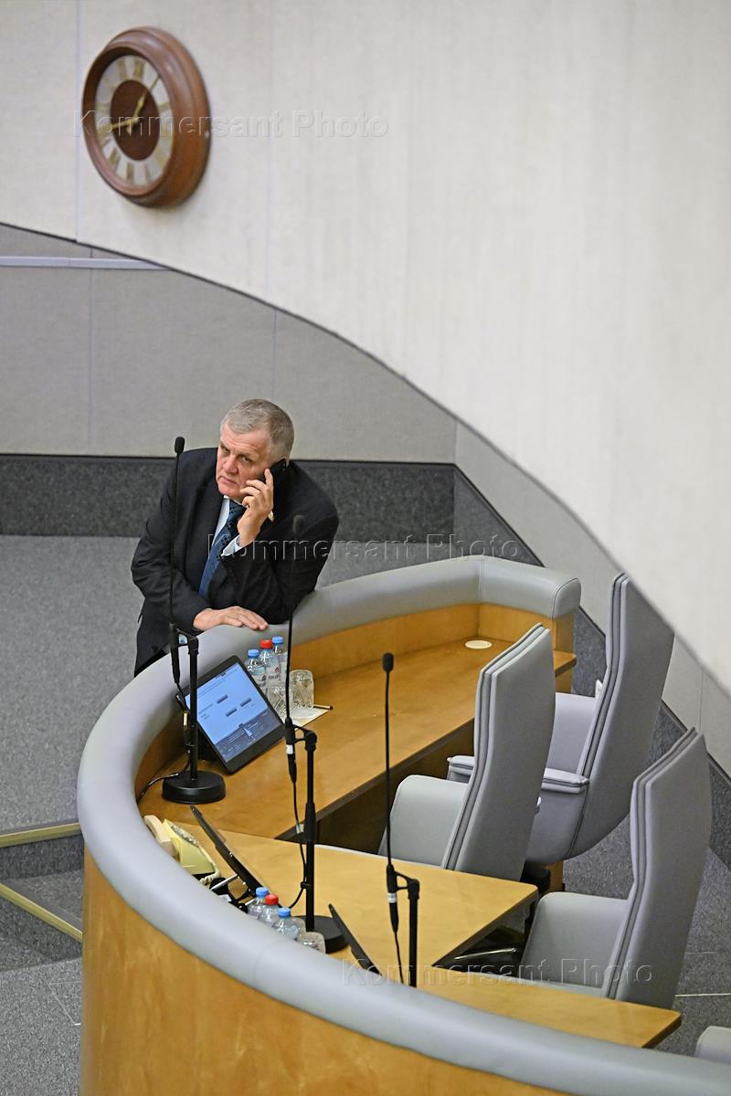 Пленарное заседание Государственной думы (ГД) России. Председатель комитета ГД России по безопасности и противодействию коррупции Василий Пискарев (в центре) во время заседания.