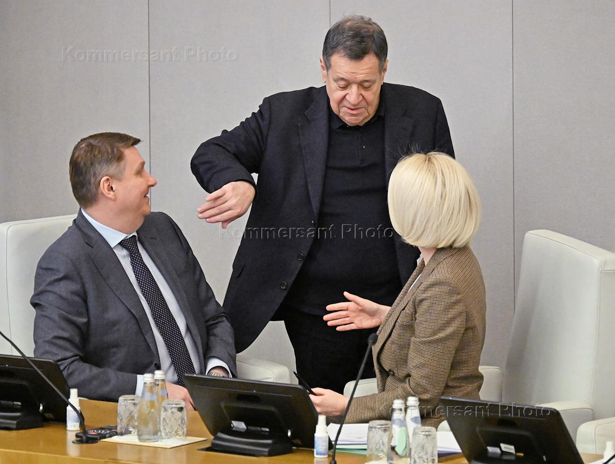 Пленарное заседание Государственной думы (ГД) России. Слева направо: председатель комитета ГД России по контролю Олег Морозов, первый заместитель председателя комитета ГД России по делам национальностей Ильдар Гильмутдинов и председатель комитета ГД России по культуре Ольга Казакова во время заседания.