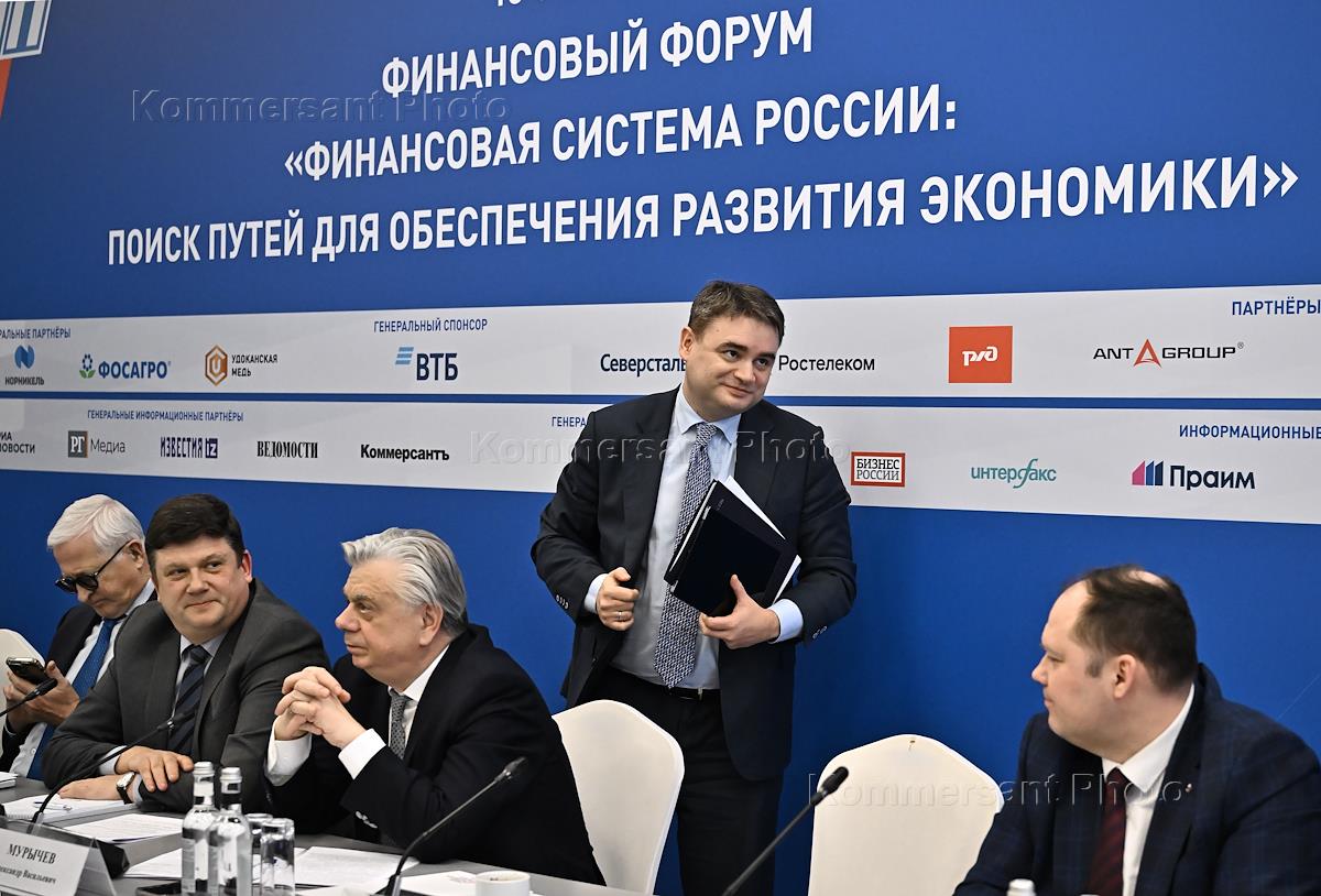 "Неделя российского бизнеса". Финансовый форум "Финансовая система России: поиск путей для обеспечения развития экономики" в Российском союзе промышленников и предпринимателей (РСПП). Первый заместитель председателя правления банка ВТБ Дмитрий Пьянов (справа) на форуме.