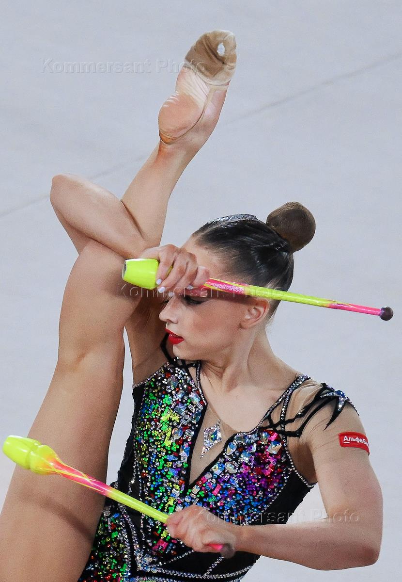 Alfa-Bank Russian Rhythmic Gymnastics Championships at the Irina Viner Gymnastics Palace. Gymnast Varvara Toporova performing with clubs.