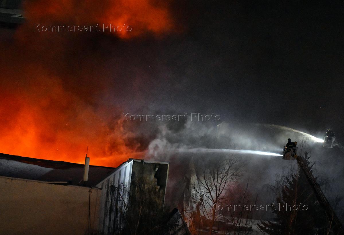 Пожар на территории завода Института точной механики и вычислительной техники им. С.А. Лебедева РАН на Варшавском шоссе. Пожарные МЧС России во время ликвидации пожара.