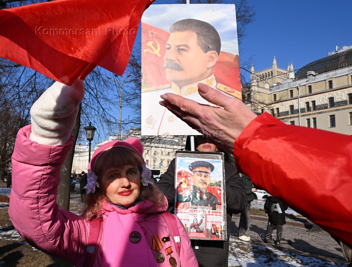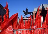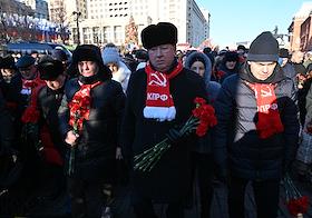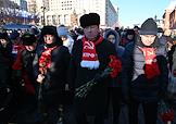 День защитника Отечества. Мероприятия организованные КПРФ. Церемония возложения венков и цветов к памятнику маршалу Георгию Жукову на Манежной площади. Жанровая фотография.