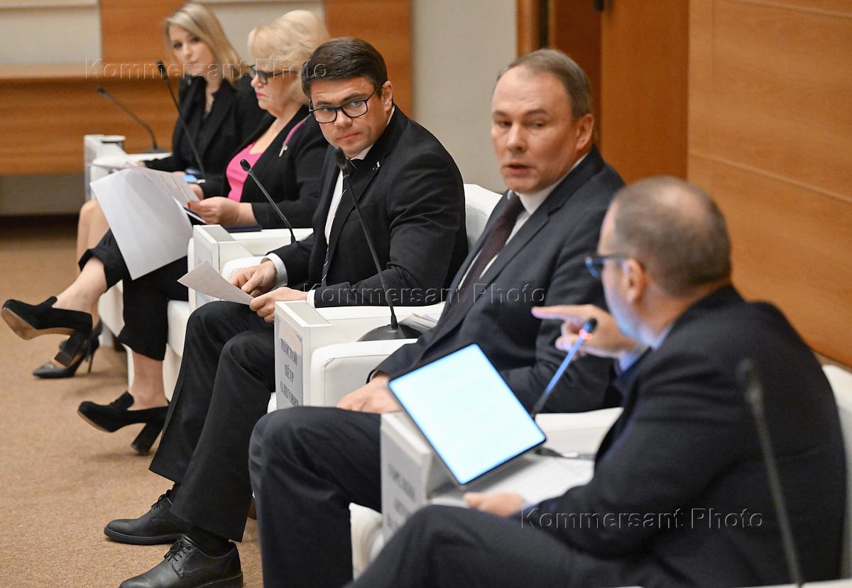 Расширенное заседание рабочей группы по подготовке к рассмотрению проекта Федерального закона "О деятельности по разработке и распространению видеоигр на территории Российской Федерации". Справа налево: заместитель председателя комитета ГД России по информационной политике, информационным технологиям и связи Антон Горелкин, заместитель председателя ГД России Петр Толстой и председатель комитета ГД России по информационной политике, информационным технологиям и связи Сергей Боярский на заседании.
