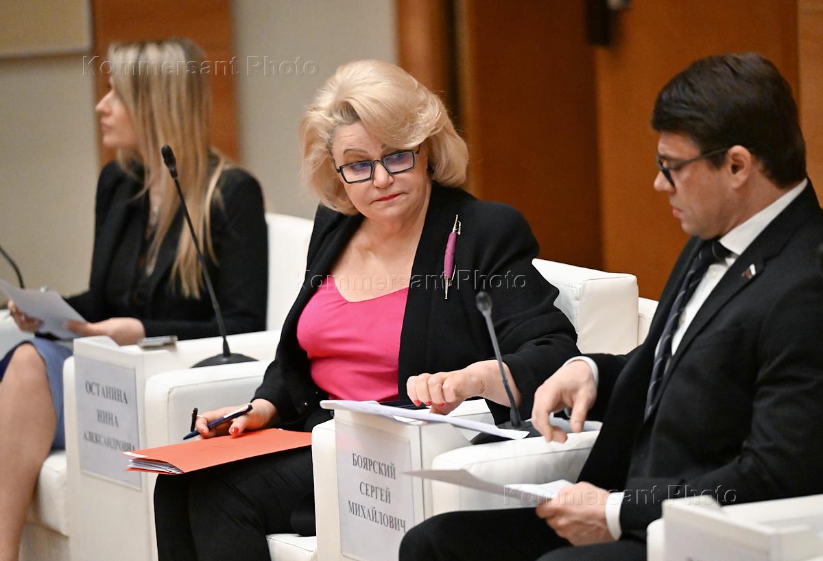 Расширенное заседание рабочей группы по подготовке к рассмотрению проекта Федерального закона "О деятельности по разработке и распространению видеоигр на территории Российской Федерации". Справа налево: председатель комитета ГД России по информационной политике, информационным технологиям и связи Сергей Боярский, председатель комитета ГД России по защите семьи, вопросам отцовства, материнства и детства Нина Останина и первый заместитель председателя комитета ГД России по просвещению Яна Лантратова на заседании.