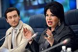 Пресс-конференция, посвященная премьерам к 80-летию Великой Победы, анонсированию новых проектов театра "Русская песня" и подготовке к юбилею народной артистки России Надежды Бабкиной, в пресс-центре ТАСС. Художественный руководитель Московского государственного музыкального театра фольклора "Русская песня" Надежда Бабкина (слева) и актер Владимир Стержаков (справа) во время пресс-конференции.