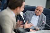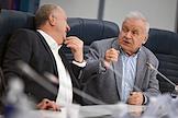 Пресс-конференция, посвященная премьерам к 80-летию Великой Победы, анонсированию новых проектов театра "Русская песня" и подготовке к юбилею народной артистки России Надежды Бабкиной, в пресс-центре ТАСС. Актеры Владимир Стержаков (слева) и Сергей Никоненко (справа) во время пресс-конференции.