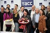 Пресс-конференция, посвященная премьерам к 80-летию Великой Победы, анонсированию новых проектов театра "Русская песня" и подготовке к юбилею народной артистки России Надежды Бабкиной, в пресс-центре ТАСС. Художественный руководитель Московского государственного музыкального театра фольклора "Русская песня" Надежда Бабкина (в центре), заместитель художественного руководителя - директора Московского государственного академического театра "Русская песня" Сергей Рябов (шестой слева), актеры Михаил Горевой (слева), Татьяна Арнтгольц (четвертая слева), Владимир Стержаков (пятый справа), Сергей Никоненко (четвертый справа) и Валентина Рубцова (третья справа) после пресс-конференции.