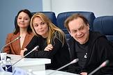 Пресс-конференция, посвященная премьерам к 80-летию Великой Победы, анонсированию новых проектов театра "Русская песня" и подготовке к юбилею народной артистки России Надежды Бабкиной, в пресс-центре ТАСС. Справа налево: актеры Михаил Горевой, Татьяна Арнтгольц и Валентина Рубцова во время пресс-конференции.