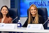 Пресс-конференция, посвященная премьерам к 80-летию Великой Победы, анонсированию новых проектов театра "Русская песня" и подготовке к юбилею народной артистки России Надежды Бабкиной, в пресс-центре ТАСС. Актрисы Татьяна Арнтгольц (справа) и Валентина Рубцова (слева) во время пресс-конференции.