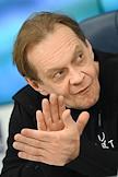 Пресс-конференция, посвященная премьерам к 80-летию Великой Победы, анонсированию новых проектов театра "Русская песня" и подготовке к юбилею народной артистки России Надежды Бабкиной, в пресс-центре ТАСС. Актер Сергей Никоненко во время пресс-конференции.