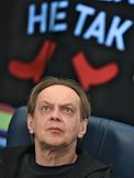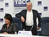 Пресс-конференция, посвященная премьерам к 80-летию Великой Победы, анонсированию новых проектов театра "Русская песня" и подготовке к юбилею народной артистки России Надежды Бабкиной, в пресс-центре ТАСС. Актер Михаил Горевой во время пресс-конференции.