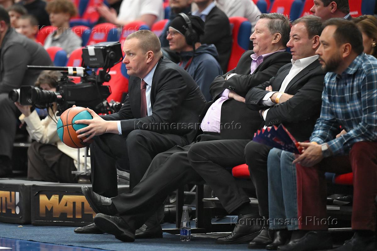 Единая лига ВТБ по баскетболу. Матч между командами ЦСКА (Москва) - УНИКС (Казань) на стадионе "Мегаспорт". Слева направо: президент, генеральный директор баскетбольного клуба ЦСКА Андрей Ватутин, специальный представитель президента России по вопросам природоохранной деятельности, экологии и транспорта, почетный президент Единой лиги ВТБ Сергей Иванов и президент Единой лиги ВТБ Сергей Кущенко во время матча.