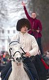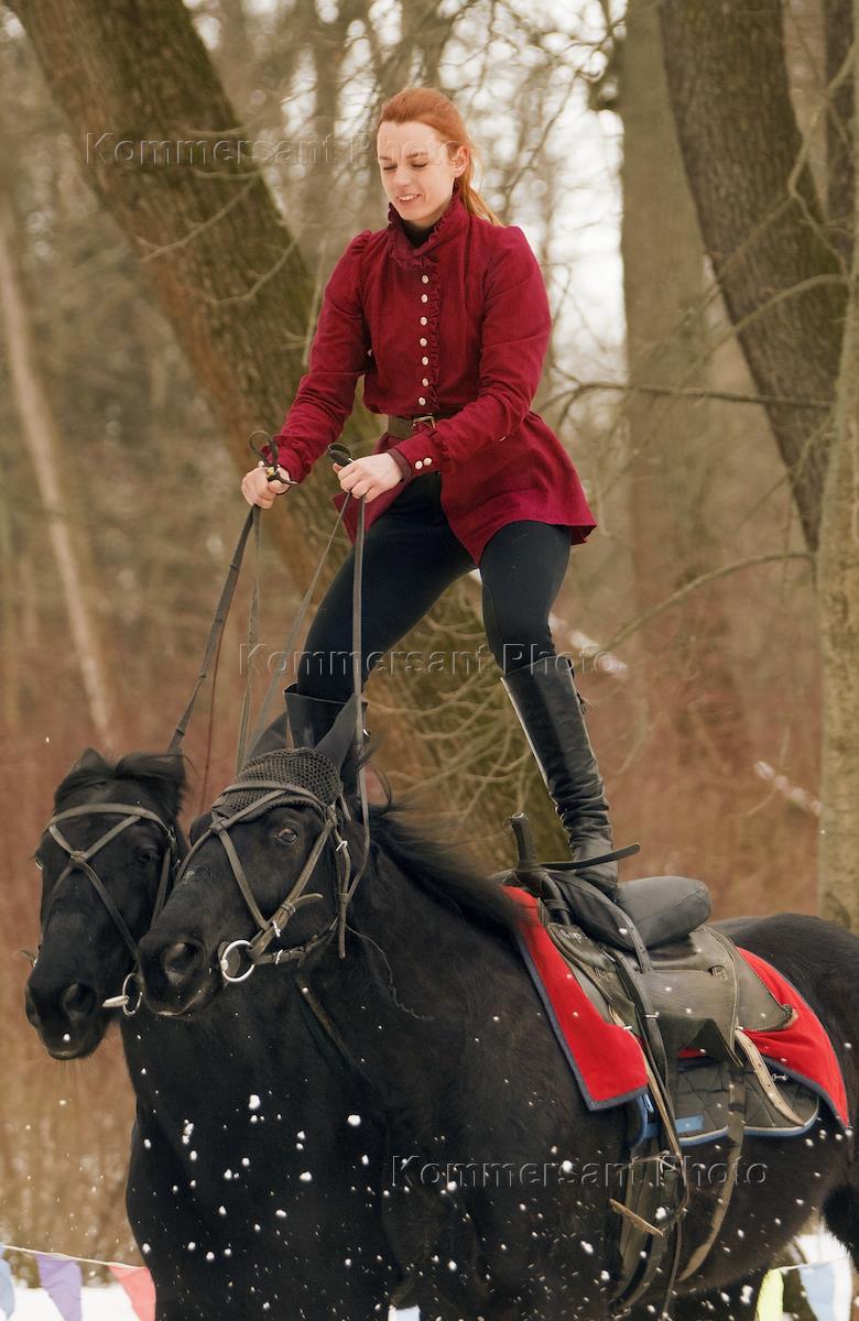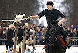Празднование Широкой Масленицы в ЦПКиО имени Кирова. Наездники во время показательных выступлений.