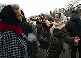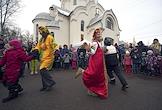 Празднование Широкой Масленицы на территории храма Тихвинской иконы Божией Матери. Участники празднования во время традиционных развлечений.