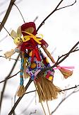 Празднование Широкой Масленицы в ЦПКиО имени Кирова. Жанровая фотография. Декоративное чучело Масленицы с зайчиком на ветке дерева.
