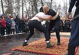 Празднование Широкой Масленицы в ЦПКиО имени Кирова. Участники празднования во время традиционных развлечений.