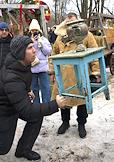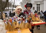 Празднование Широкой Масленицы в ЦПКиО имени Кирова. Коробейники с декоративными чучелами Масленицы в народных костюмах.