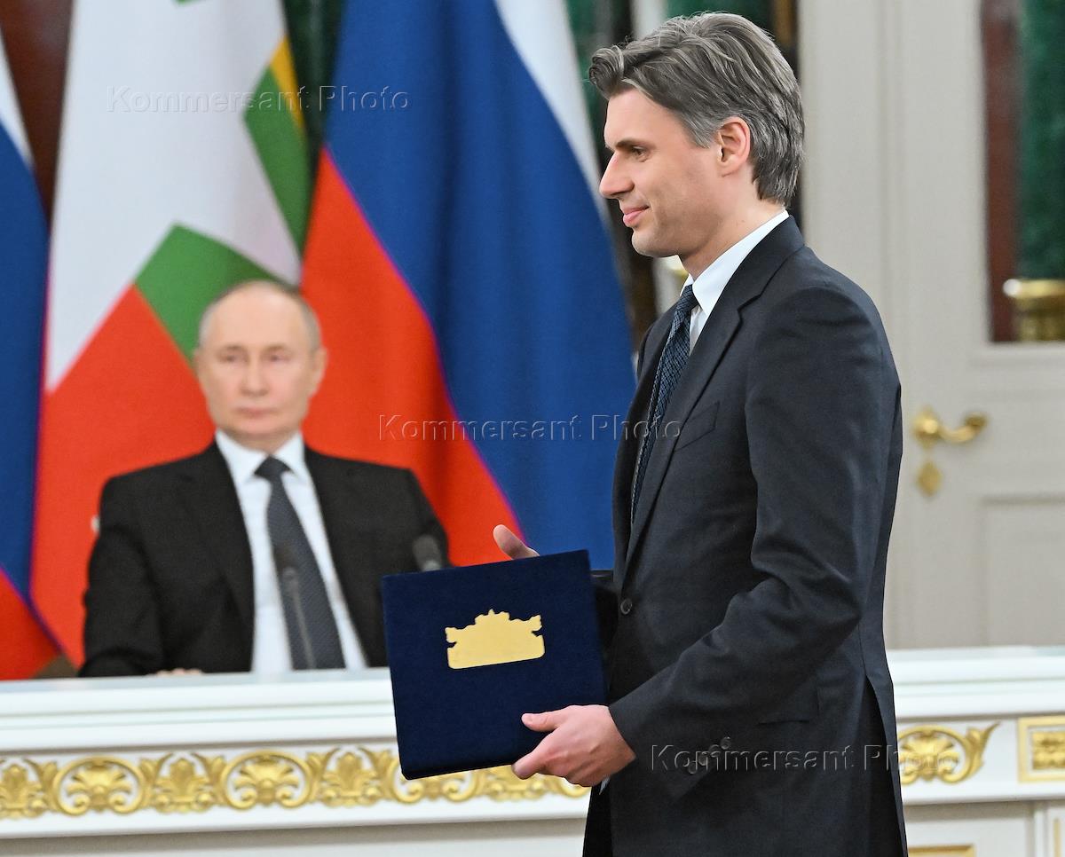 Церемония подписания документов по итогам переговоров президента России Владимира Путина с председателем Государственного административного совета, премьер-министром Мьянмы Мин Аун Хлайном, находящимся в России с официальным визитом. Министр спорта России Михаил Дегтярев (слева) и министр просвещения России Сергей Кравцов (справа) перед началом церемонии.