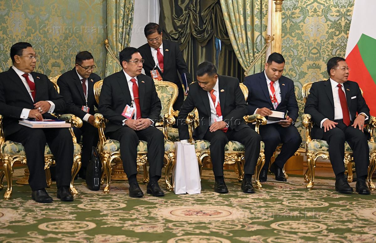Переговоры президента России Владимира Путина с председателем Государственного административного совета, премьер-министром Мьянмы Мин Аун Хлайном, находящимся в России с официальным визитом. Секретарь Государственного административного совета, советник по военным вопросам председателя Государственного административного совета Мьянмы Е Вин У (второй слева) и председатель Государственного административного совета, премьер-министр Мьянмы Мин Аун Хлайн (справа) во время переговоров в зеленой гостиной Большого Кремлевского дворца.