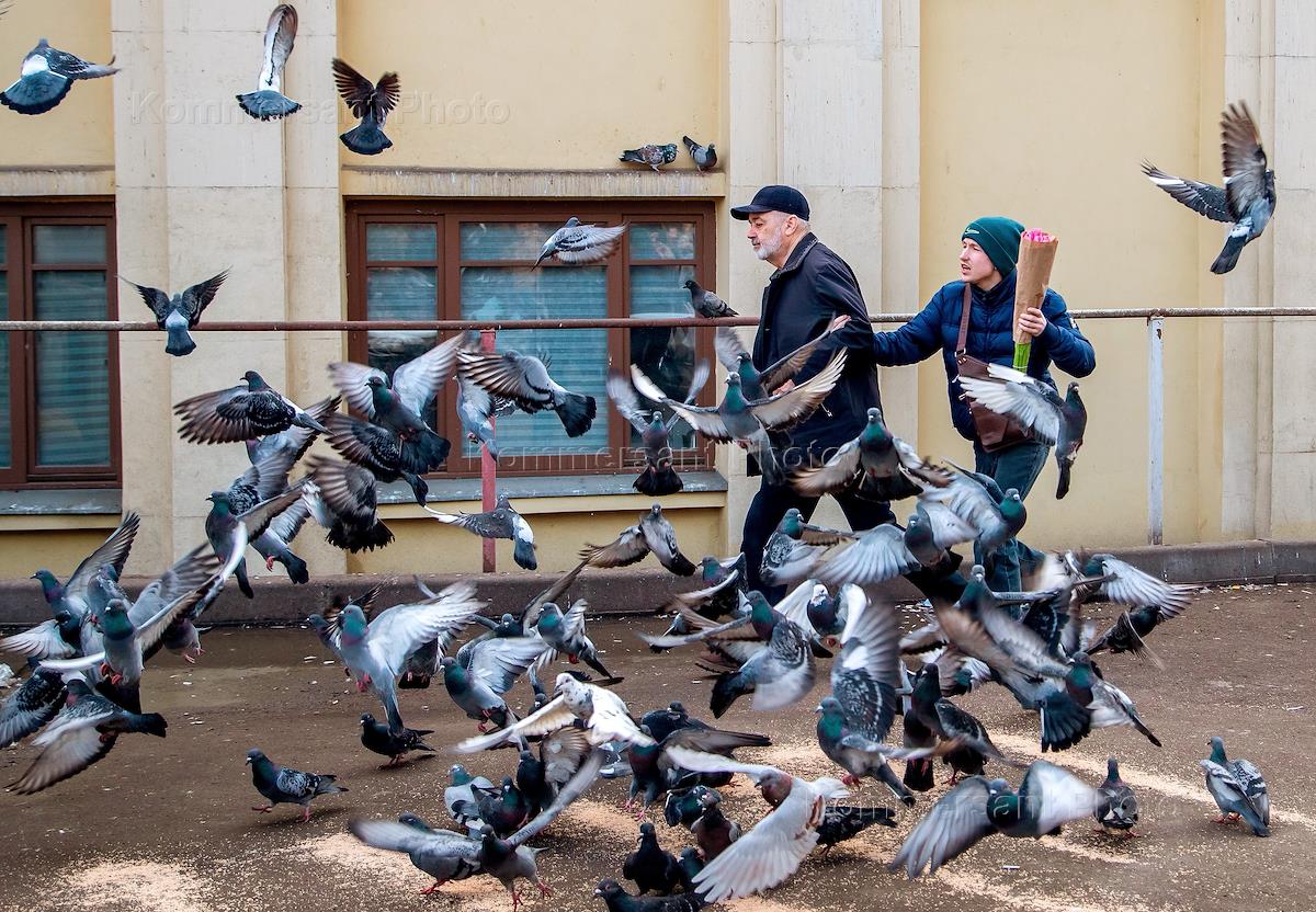 Продажа цветов к Международному женскому дню 8 марта на Рижском рынке. Жанровая фотография. Пожилой мужчина и парень с букетом тюльпанов и стая голубей.