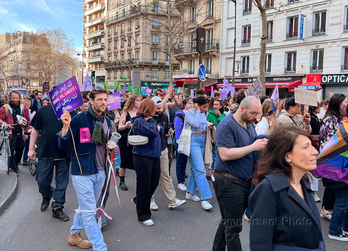 Демонстрация за права женщин, посвященная Международному женскому дню 8 марта. Участники во время демонстрации.