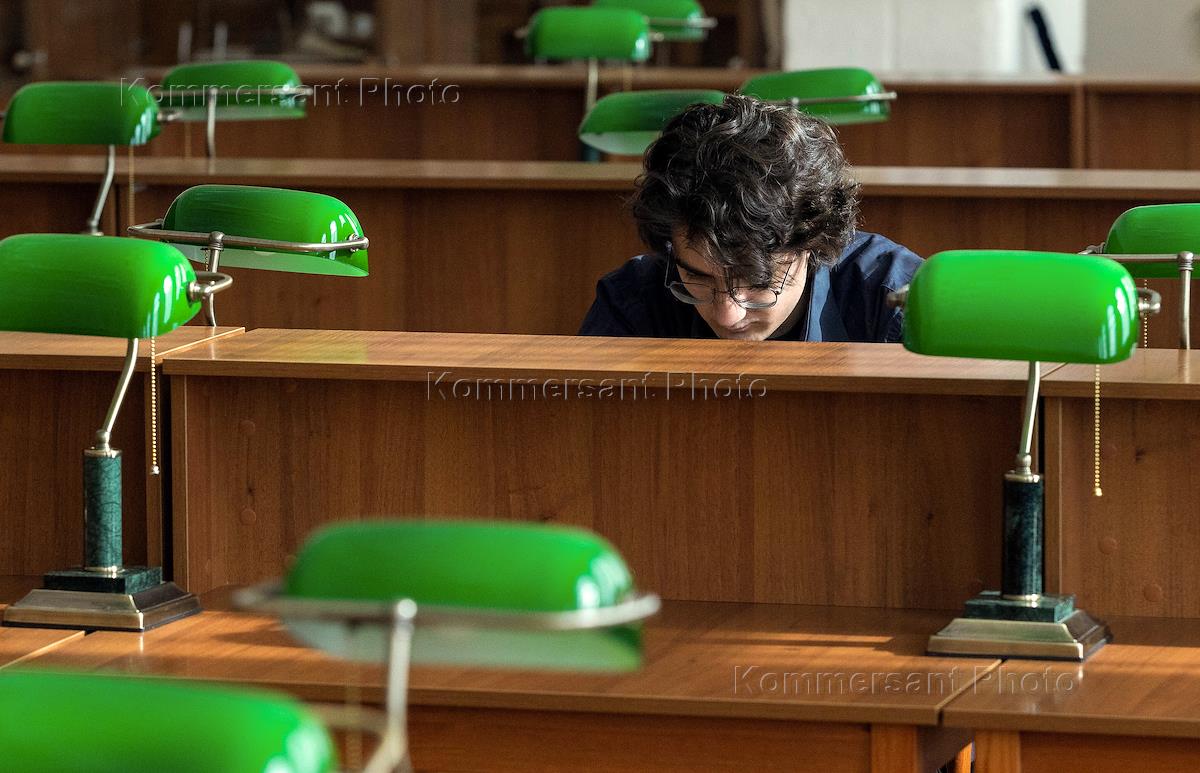 Opening ceremony of the regional meeting "Presidential Library in the Middle Urals: historical context and personal stories" at the Sverdlovsk Belinsky Regional Universal Scientific Library. Genre photography. A library visitor reads a book in the professor's hall of the library.
