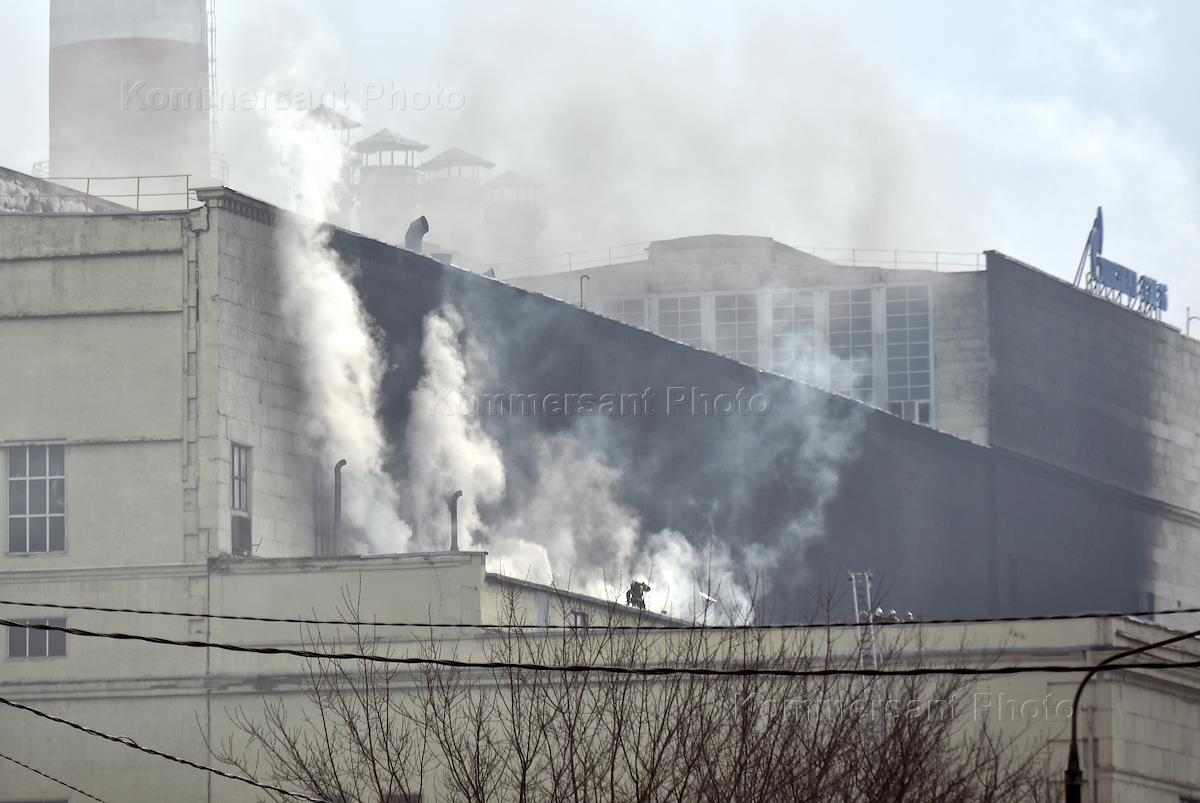 Fire at CHPP-16 on 3rd Khoroshevskaya Street. Smoke from fire on the roof of a thermal power plant building. Employees of the fire service of the Ministry of Emergency Situations of Russia while extinguishing fire.