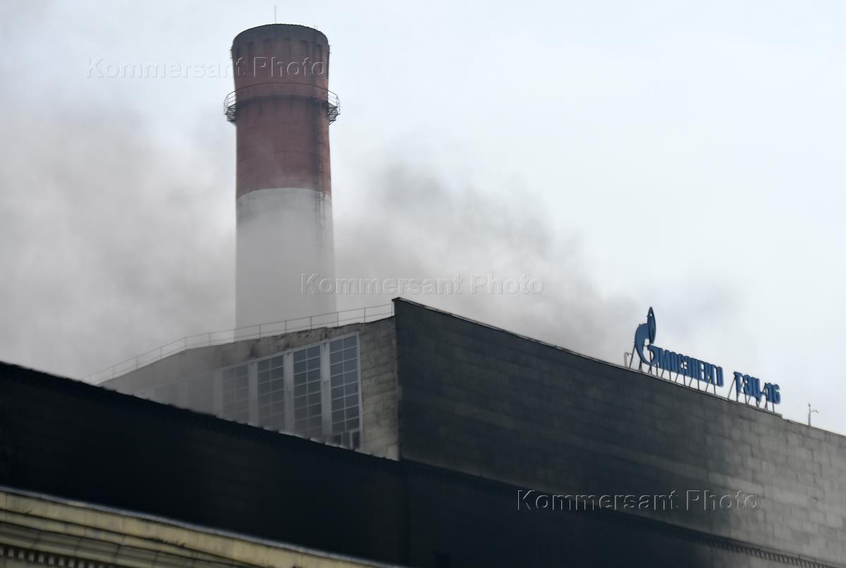 Fire at CHPP-16 on 3rd Khoroshevskaya Street. Smoke from fire on the roof of a thermal power plant building.