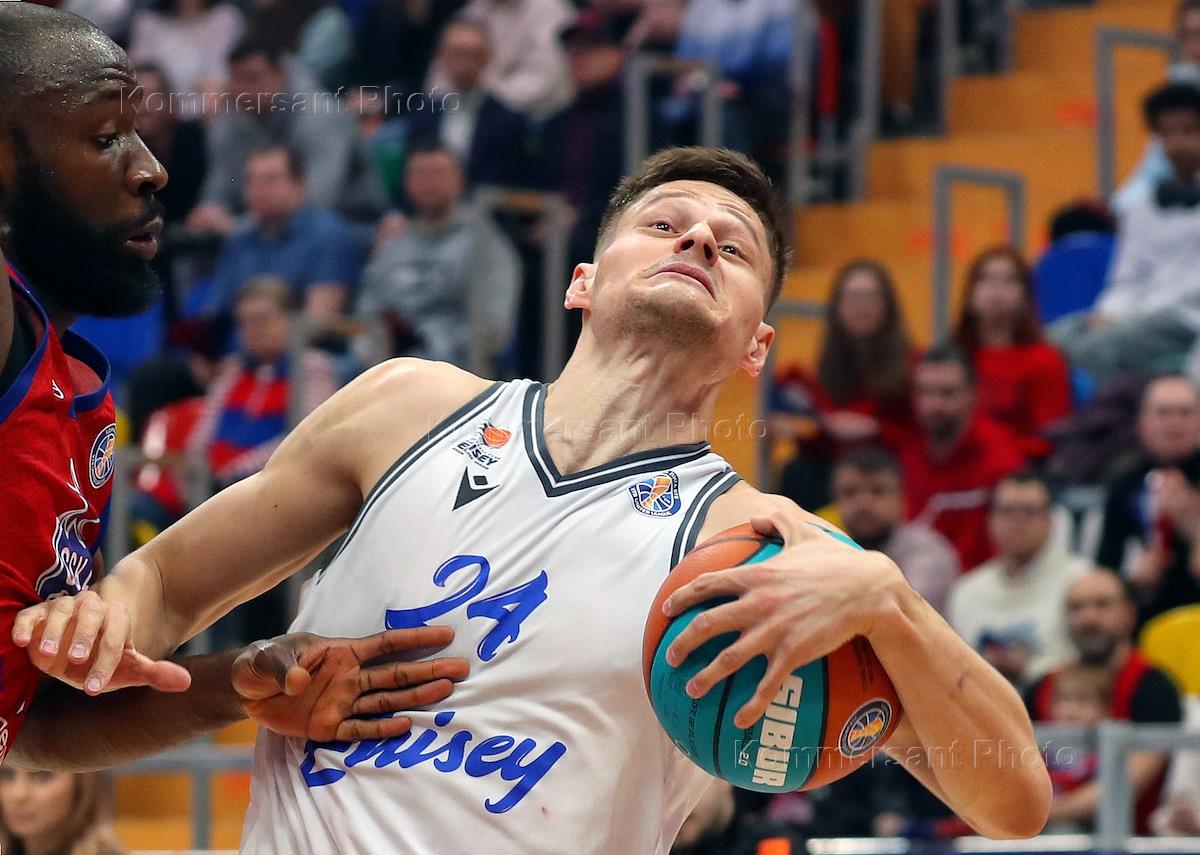 Единая лига ВТБ по баскетболу. Матч между командами ЦСКА (Москва) - "Енисей" (Красноярск) во Дворце спорта "Мегаспорт" им. А.В. Тарасова. Игрок команды "Енисей" Тимофей Герасимов (справа) во время матча.