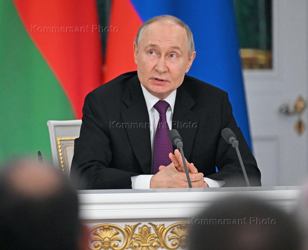 Переговоры президента России Владимира Путина с президентом Белоруссии Александром Лукашенко в Кремле. Президент России Владимир Путин во время пресс-конференции по итогами переговоров.